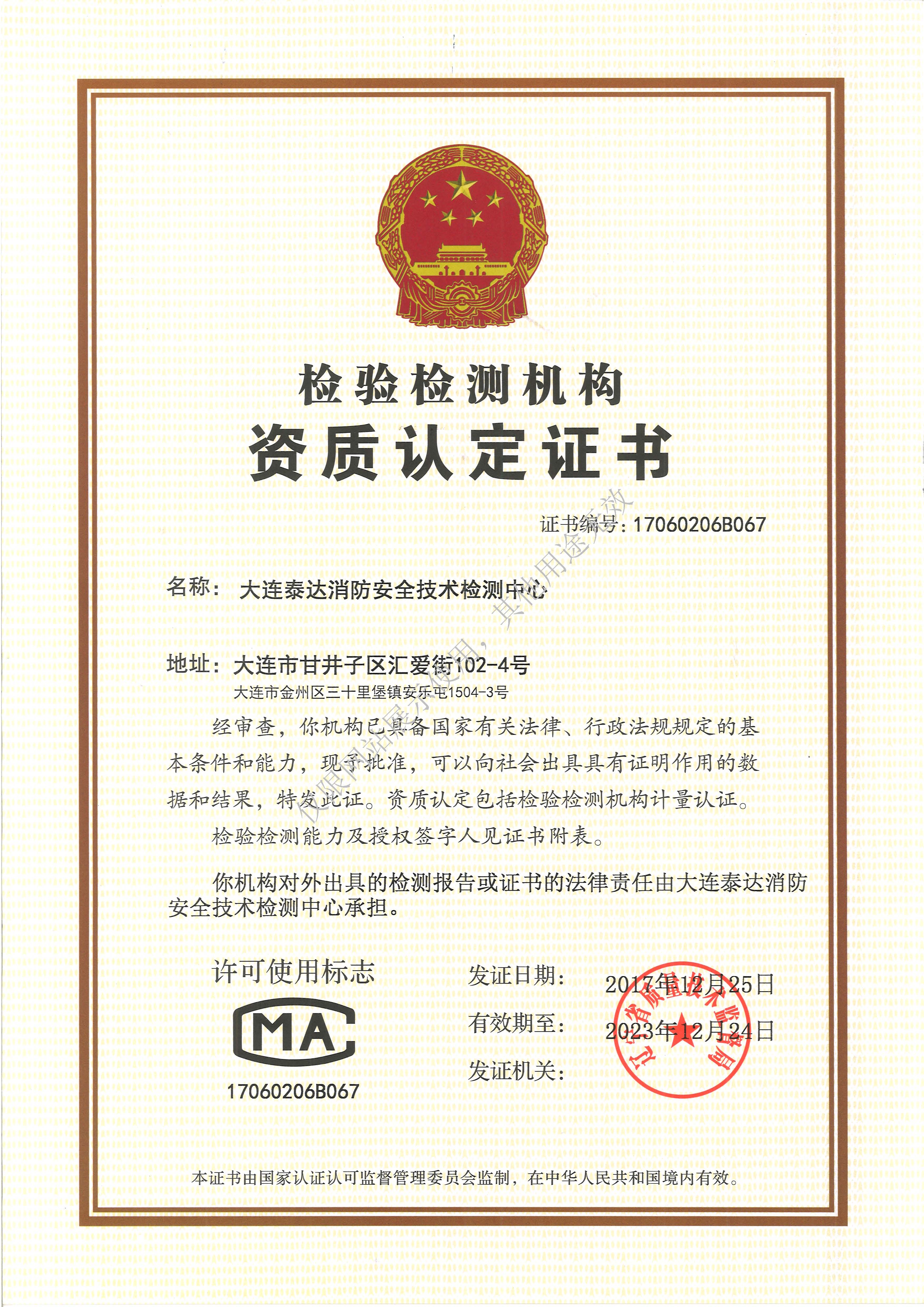 · 大連泰達消防安全技術檢測中心成立于2003年3月,是一家專注從事消防設施維護保養、消防設施檢測、電氣防火檢測、消防安全評估、雷電防護裝置檢測、防火涂料檢測、消防技術咨詢與消防培訓等專業消防技術服務的企業。